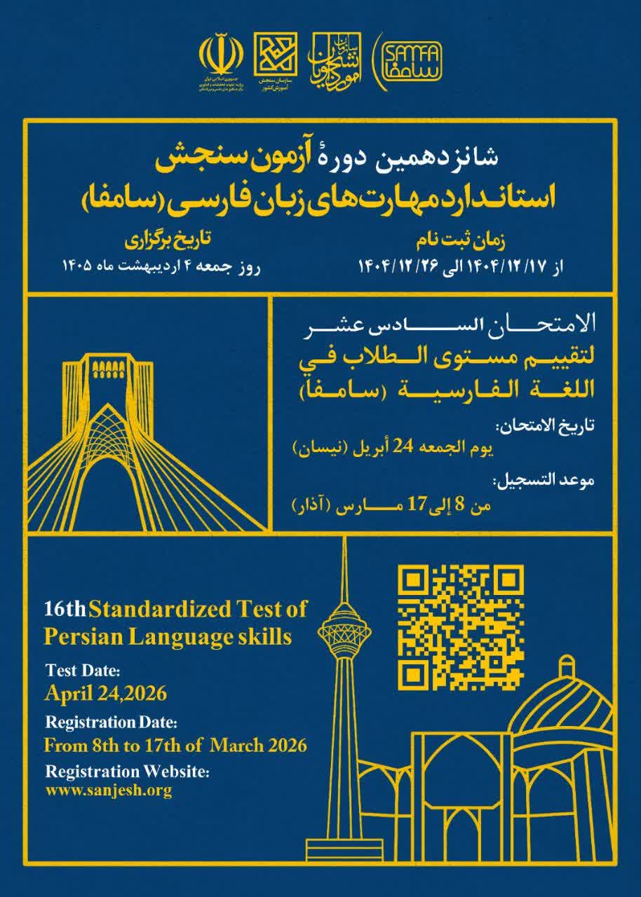 16th Standardized Test of Persian Language Skills training course will be held on April 24.2026. The registration deadline for participation in this course is from 8th to17th of March 2026. Those interested in participating in this course can contact Mr. Meysam Ghorbani at: +989370873824 and email:meysam.ghorbani7@yahoo.com